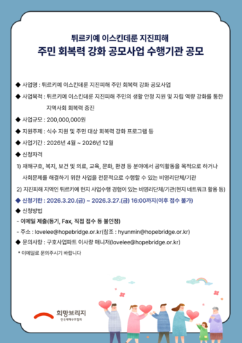 희망브리지, 튀르키예 지진 피해 이재민 자립 돕는 '3차 공모사업'...