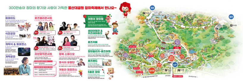 자세한 축제 일정은 ‘울산대공원 장미축제’ 누리집(ulsanrosefestival.com)과 ‘울산관광누리집’(tour.ulsan.go.kr)에서 확인할 수 있으며 그 외 문의는 해울이콜센터(052-120)로 하면 된다.