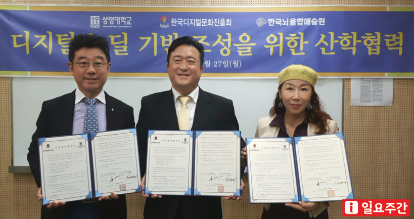 [일요주간 = 노현주 기자] 한국디지털문화진흥회(회장 16대 국회의원 이승철)와 그 직속기관인 한국뇌융합예술원(원장 김영화 화백), 상명대(총장 백중기)는 지난 7월 27일 상명대 미래백년관 산학협력단 컨퍼런스홀에서 정부의 디지털뉴딜 기반조성을 위한 산학협력을 체결하였다.