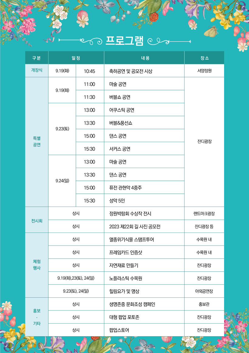 이밖에도 박람회 기간 동안 수목원의 자연환경 속에서 휴식과 즐거움을 느낄 수 있도록 마술 등 문화예술공연, 멸종위기식물 스탬프 투어, 길 사진 공모전 전시회 등의 체험 프로그램도 운영되며, 방문객들이 정원조성에 쉽게 다가갈 수 있도록 정원용품 직거래 장터인 ‘파머스 가든’도 열릴 예정이다.