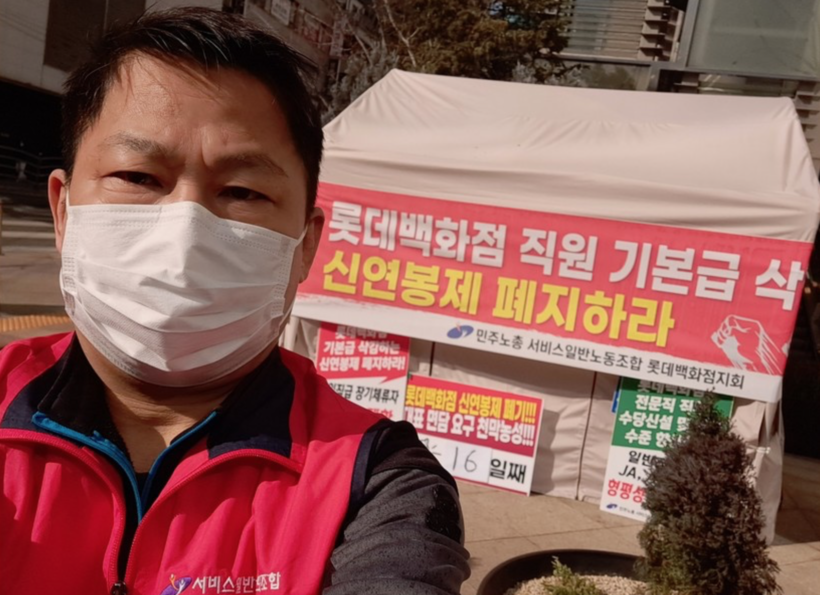 ▲최영철 롯데백화점지회장은 사규에 따라 승인된 휴가를 휴가를 축소해 출근을 압박한 건 '탄압'이며 '괴롭힘'이라는 주장했다. 최 지회장은 서울 중구 소공동 롯데백화점 본사 앞에서 신연봉제 폐기, 인사제도 파기, 동일 직급 장기 체류자 철폐, 전문직 직원 처우 개선 촉구를 위한 천막 농성을 진행하고 있다. |
