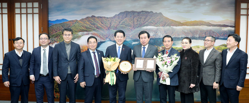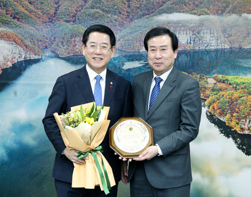 [일요주간=김영란 기자] 김영록 전라남도지사는 5일 도청에서 제104회 전국체육대회와 제43회 전국장애인체육대회의 성공 개최에 크게 공헌한 박홍률 목포시장에게 감사패를 전달했다.