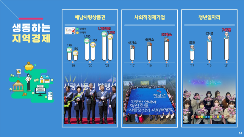 지난 2019년 도입된 해남사랑상품권은 전국 군단위 최대 발행·판매 실적으로 코로나 경제위기를 극복하는 마중물 역할을 했으며, 방역과 축제가 조화를 이룬 모범사례로 평가받은 해남미남축제 성공개최도 관광활성화에 큰 역할을 했다. 해남사랑상품권은 발행 첫해 170억 원에서 지난해에는 1750억 원까지 발행액을 늘리며 3년만에 10배 이상 성장하기도 했다.