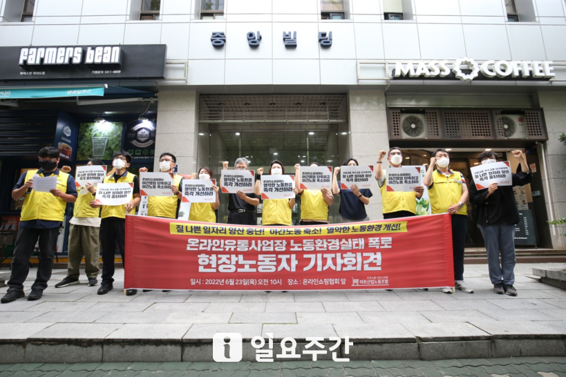 ▲민주노총 서비스연맹 마트산업노조가 지난 23일 서울 여의도동 온라인쇼핑협회 앞에서 온라인 유통사업장 노동환경실태 폭로 기자회견을 열었다. <사진=성지온 기자> |