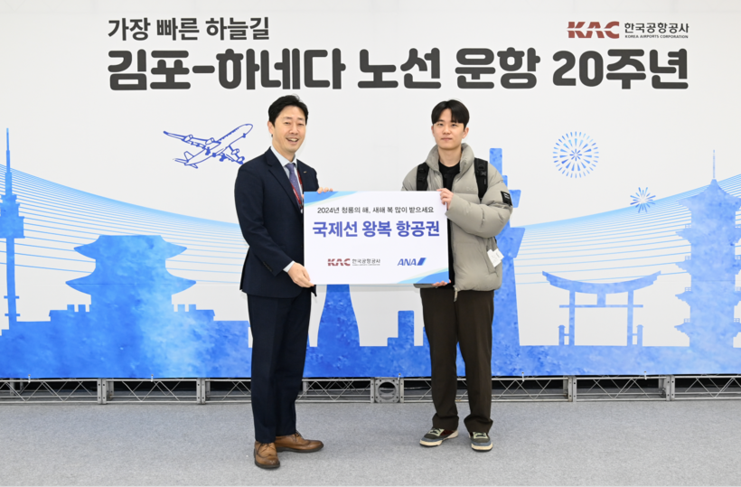 ▲ 1일, 김포국제공항에서 윤형중 한국공항공사 사장(왼쪽)이 첫 국제선 이용객에게 김포-하네다 노선 왕복 항공권을 증정하고 있다. (사진=한국공항공사) |