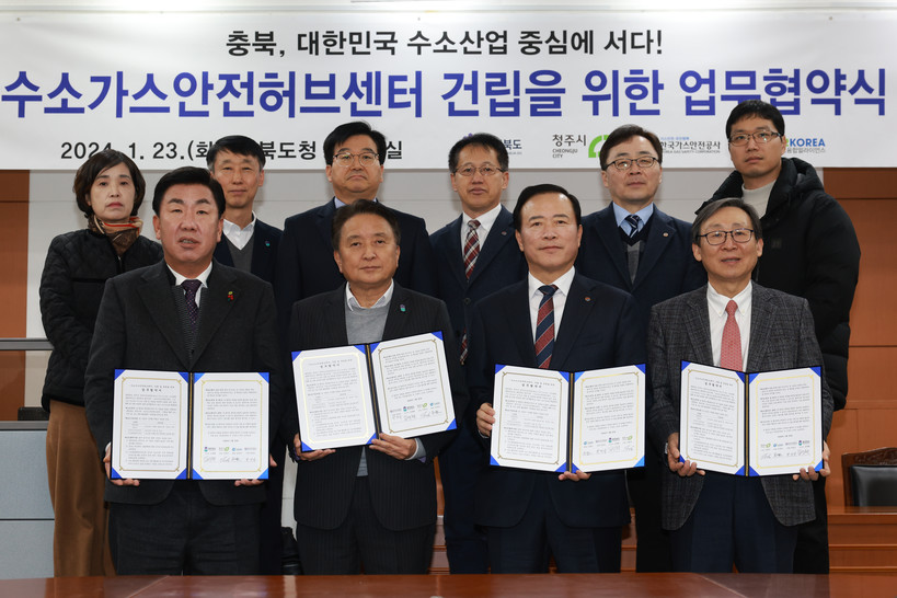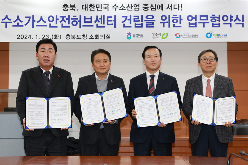 [일요주간=김영란 기자] 충청북도는 23일 충북도청에서 청주시, 한국가스안전공사(국가 수소안전 전담기관), 수소융합얼라이언스(국가 수소진흥 전담기관)와 수소가스안전허브센터 건립을 위한 업무협약을 체결했다.