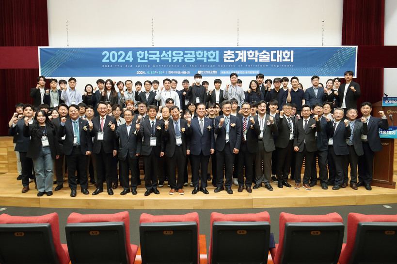 ▲ 2024 한국석유공학회 춘계학술대회 참가자들이 기념촬영을 하고있다. (사진=석유공사) |
