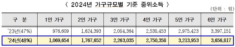 ▲ 2024년 가구규모별 기준 중위소득 (표=서울시) |