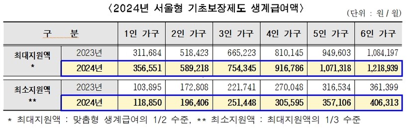 ▲ 2024년 서울형 기초보장제도 생계급여액 (표=서울시) |