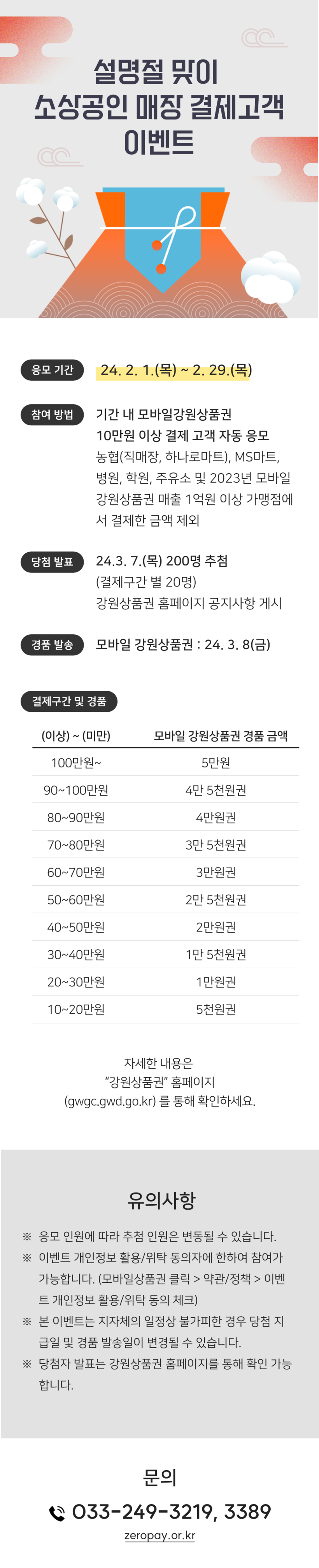 해당 기간 결제금액 중 농협매장, 대형마트 등 강원상품권 매출 연 1억원 이상 가맹점에서 결제한 금액을 제외하고 전통시장 또는 소상공인 매장에서 누적 결제금액 100,000원 이상 사용 고객은 별도 신청 없이 자동으로 응모되며, 추첨을 통해 총 200명에게 5,000원에서 50,000원의 모바일 상품권을 경품으로 지급할 예정이다. 자세한 사항은 강원상품권 홈페이지(gwgc.gwd.go.kr) 에서 확인할 수 있다.