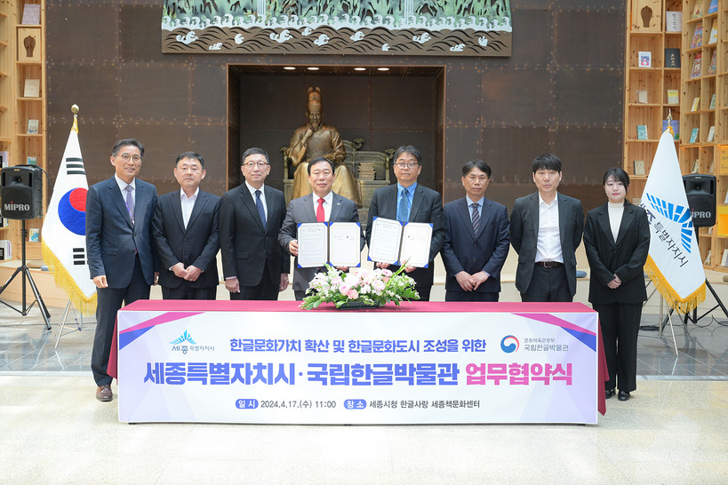 [일요주간=김영란 기자] 세종특별자치시(시장 최민호)가 한글문화의 보존, 확산 및 진흥에 관한 사무를 관장하는 국립한글박물관과 협약을 맺고 한글문화 가치 확산 및 한글문화도시 세종 조성에 힘을 모으기로 했다.