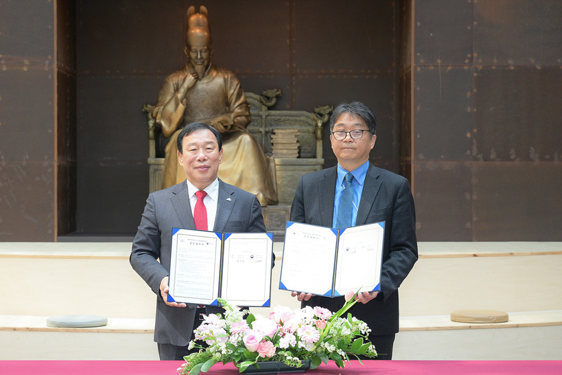 ▲ 세종시-국립한글박물관 업무협약식_왼쪽부터 최민호 시장, 김일환 국립한글박물관장(사진=세종시) |