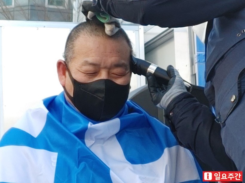 | ▲이진헌 삼성웰스토리노조 위원장이 4일 삼성웰스토리 본사 앞에서 열린 결의대회에서 삭발을 단행하며 사측을 향한 강도 높은 투쟁을 예고했다.(사진=성지온 기자) |