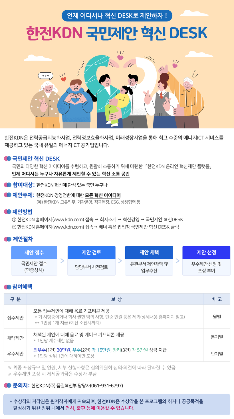 한편, “국민제안 혁신 DESK”는 국민 누구나 한전KDN의 경영 전반에 대해 혁신 아이디어를 제안할 수 있으며 모든 제안에 대해 기프티콘을 지급한다. 보다 자세한 사항은 한전KDN 홈페이지 “회사소개–혁신경영–국민제안 혁신 DESK”를 통해 확인할 수 있다.