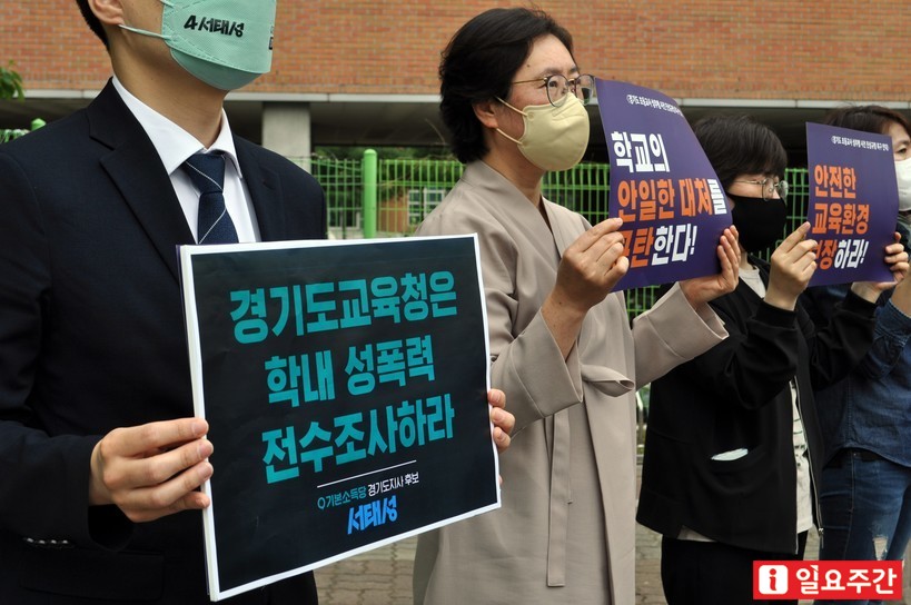 ▲ ‘경기도 초등교사 성추행 진상규명 촉구 연대’가 지난 13일 수원시 경기도교육청 남부청사 앞에서 기자회견을 열고 제자를 성추행한 가해교사에 대한 처벌과 성추행 사건 진상 규명을 촉구했다. <사진=성지온 기자> |