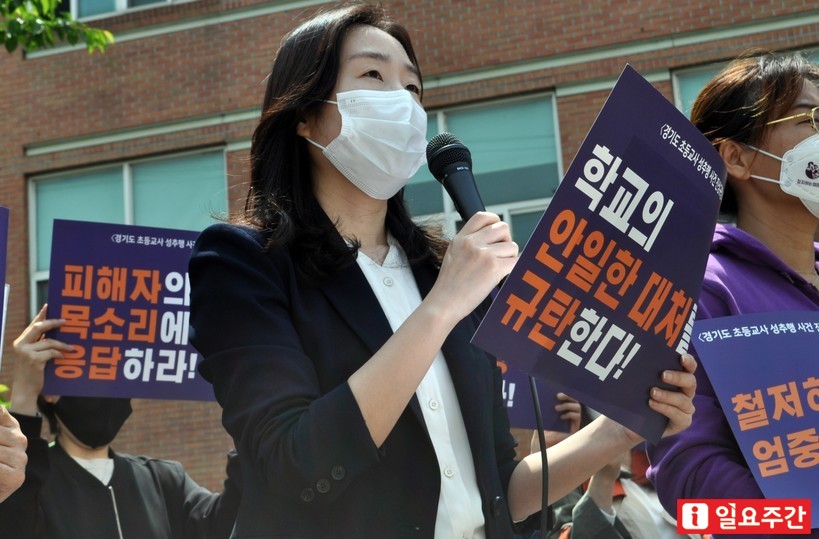 ▲공익인권법재단 공감의 김지혜 변호사는 지난 13일 경기도 수원시 경기도교육청 남부청사 앞에서 열린 경기도 초등교사 성추행 진상규명 촉구 기자회견에 참석했다. <사진=성지온 기자> |