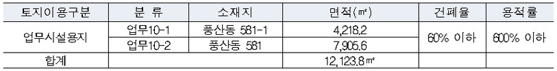 하남시 풍산동 하남사업본부 사옥부지는 업무시설용지 2필지로, 허용용도는 오피스텔을 포함한 일반업무시설(건축법시행령 별표1, 제14호의 나목), 1·2종 근린생활시설(일부시설 제외), 문화및집회시설 등이다.