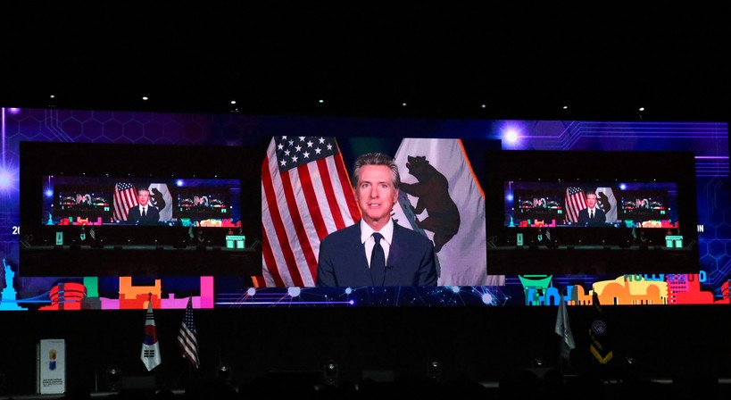 ▲ 개빈 뉴섬 캘리포니아 주시사 영상 축사 (사진=정승덕 기자) |
