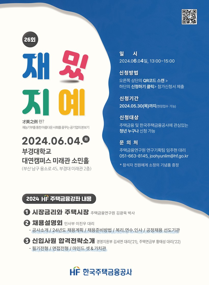 [일요주간=김영란 기자] 한국주택금융공사(HF, 사장 최준우)는 주택금융 분야 지식과 신입직원 채용정보 등을 제공하는 ‘재밌지예(才美之例)’ 주택금융 강좌를 6월 4일 부산광역시 남구 용소로에 위치한 부경대학교에서 개최한다고 17일 밝혔다.
