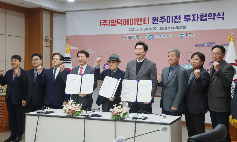[일요주간=김영란 기자] 강원특별자치도가 원주시, (주)광덕에이앤티와 함께 2월 29일 도청 본관 소회의실에서 투자협약식을 체결하였다.