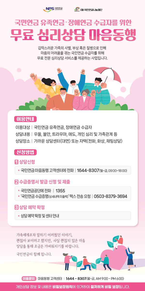 2023년부터 시작된 ‘국민연금 마음동행’은 갑작스러운 사고와 질병으로 인해 본인이 장애를 입거나 가족이 사망하여 상실감, 우울감 등을 겪고 있는 연금수급자가 이를 극복할 수 있도록 무료로 심리상담을 제공하는 사업이다.