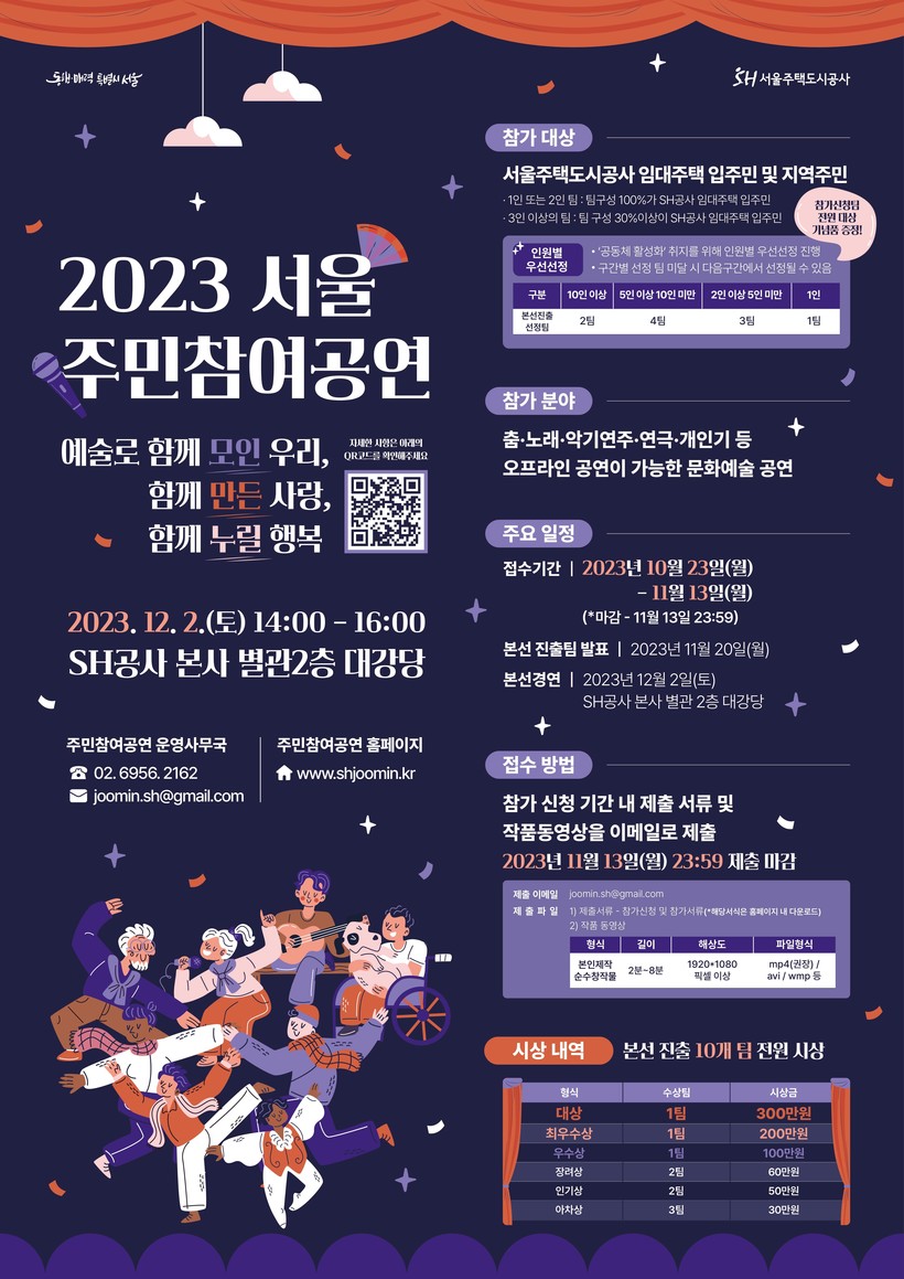 SH공사는 ‘2023년 주민참여공연’을 개최하고 11월 13일까지 작품을 접수받는다고 30일 밝혔다.