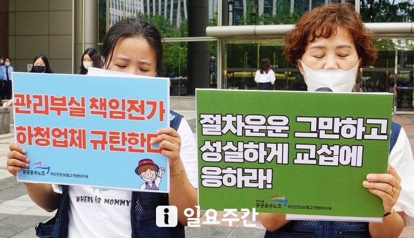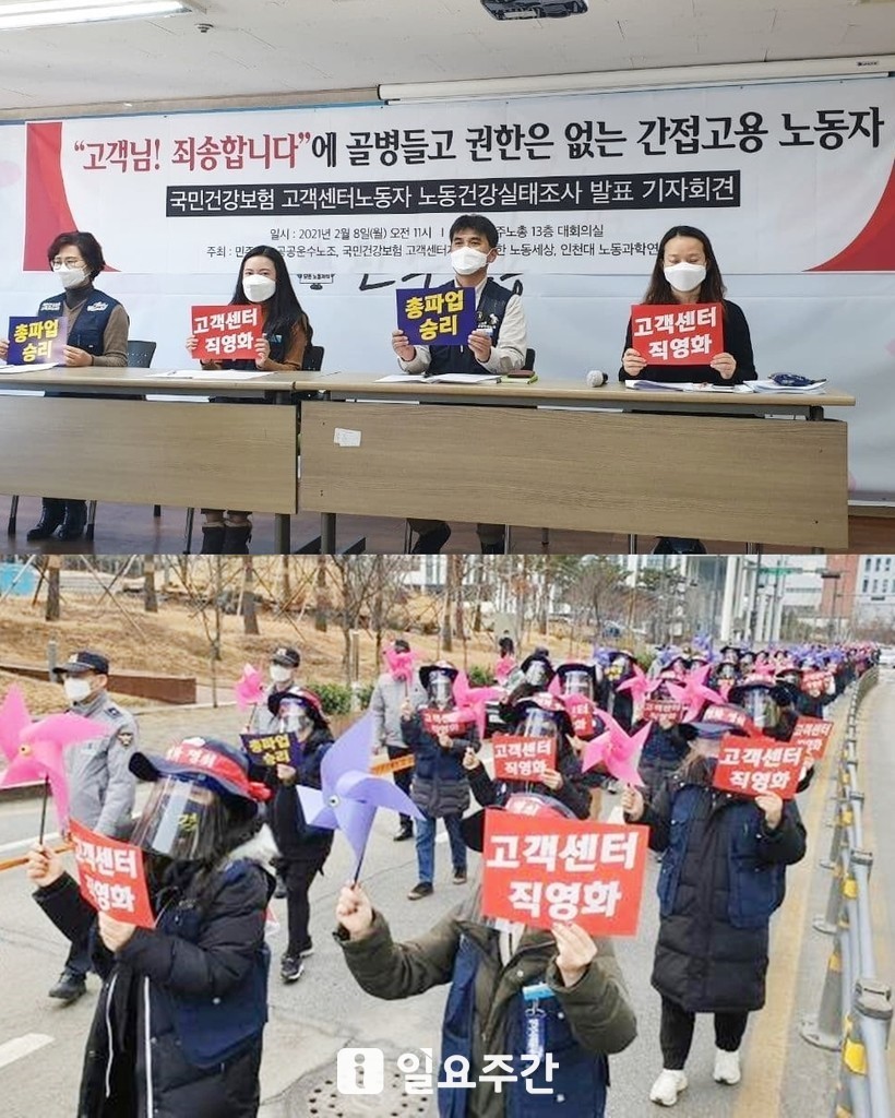 앞서 지난 6일 민주노총 공공운수노조 국민건강보험고객센터지부는 서울 영등포구 CCMM 빌딩 앞에서 민간 위탁업체를 규탄하는 기자회견을 연 바 있다. 이들은 공단의 관리·감독이 소홀한 틈을 타 상담사들에 대한 부당노동행위가 벌어지고 있다고 증언했다.