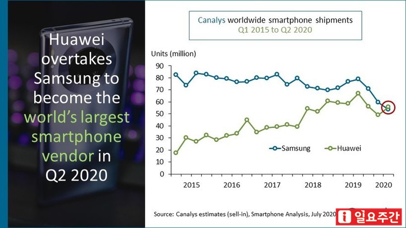 화웨이는 전년 동기대비 올 2월의 출하량이 5% 줄어드는데 그쳤지만 삼성전자는 무려 30%의 출하량 감소를 경험했다. 이 결과 화웨이는 2020년 2분기 동안 총 5370만대의 단말기를 출하 삼성을 꺾었다.