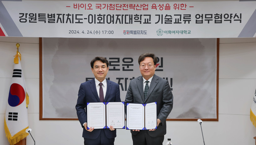 [일요주간=김영란 기자] 강원특별자치도는 4. 24.(수) 도청에서 이화여자대학교와 바이오 국가첨단전략산업 육성을 위한 기술교류 업무협약을 체결하였다.