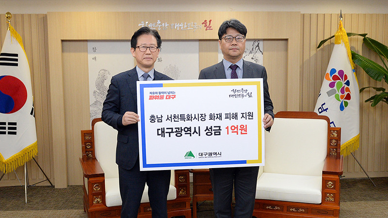 [일요주간=김영란 기자] 대구광역시는 2월 15일(목) 충청남도청을 방문해 서천특화시장 대형화재 피해복구 지원 성금 1억 원을 전달했다. 이번 성금은 지난달 22일 발생한 서천특화시장 화재로 재산 피해를 입은 상인들을 위로하고 신속한 복구 활동을 지원하고자 마련됐다.