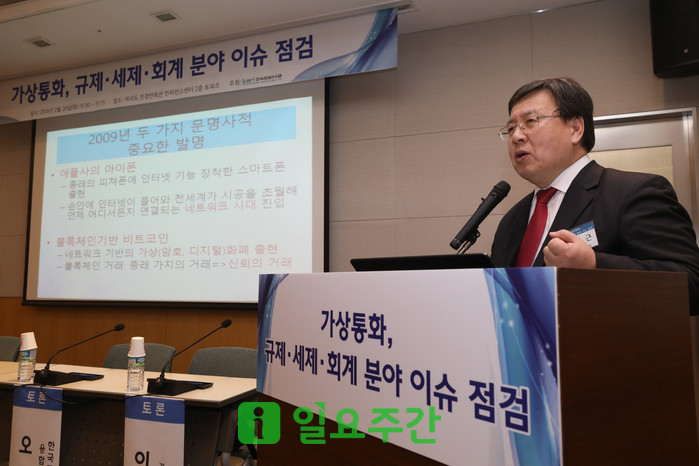 | ▲ 지난해 2월 열린 한국경제연구원 '가상통화, 규제·세재·회계 분야 이슈 점검' 세미나에서오정근 건국대학교 금융IT학과 교수가 '가상화폐의 해외 규제사례와 시사점'이라는 주제로 발제하고 있는 모습. |