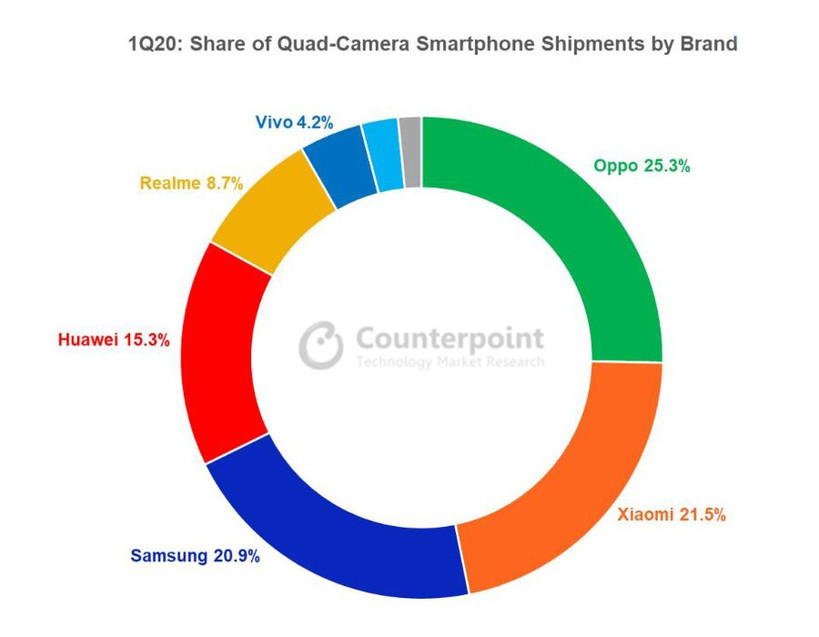 다음 브랜드는 오포로 2020년 1분기에 출하된 스마트폰의 절반 이상을 차지했으며, 여전히 보급형 모델을 많이 판매하고 있는 삼성전자과 화웨이는 스마트폰의 3분의 1 미만에 쿼드 카메라 시스템을 탑재했다.