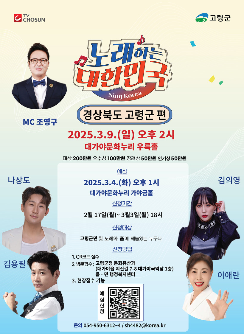 한편, ‘노래하는 대한민국 경북 고령군편’은 ‘싱코리아 경북 고령군편’이라는 타이틀로 4월 20일 일요일 16:30에 TV조선을 통해서 방영될 예정이다.