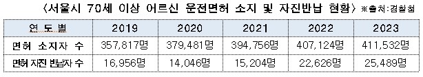▲ 서울시 70세 이상 어르신 운전면허 소지 및 자진반납 현황(출처=경찰청) |