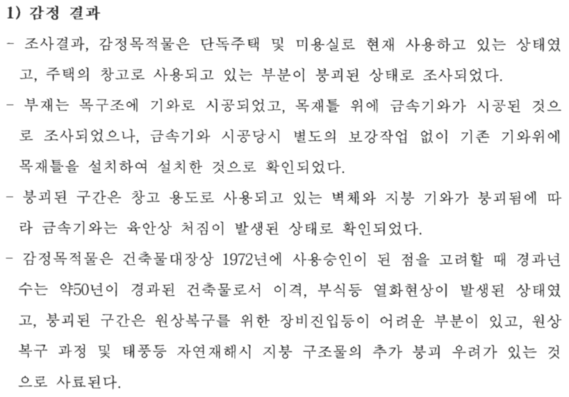 해당 주택 감정인은 감정서에서 “붕괴된 구간을 부재별 가중치를 적용해 판단한 결과 약 24.4%로 보이나 감정목적물의 구조, 노후화 등을 고려할 경우 붕괴된 잔해 철거 시 기와 등의 추가붕괴 우려가 있다”고 밝혔다.