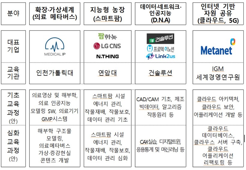 선정된 4개 분야별 연합체는 ▲확장·가상세계(의료 메타버스) = 메디컬아이피·인천가톨릭대 ▲ 지능형농장(스마트팜) = 팜한농·LG CNS·엔씽·연암대 ▲데이터·네트워크·인공지능(D.N.A) = 건솔루션·프로텍이노션·링크투어스 ▲인터넷 기반 자원 공유(클라우드·5G) = 메타넷·IGM세계경영연구원이다.