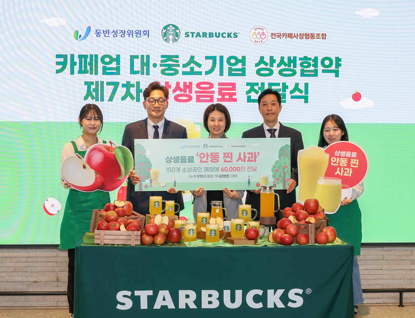 [일요주간 = 노현주 기자] 스타벅스 코리아(대표이사 손정현)는 동반성장위원회(이하 동반위)와 전국카페사장협동조합(이하 카페조합)과의 ‘카페업 상생협약’을 새롭게 체결하고 경북 안동 사과로 만든 제7차 상생음료 ‘안동 찐 사과’를 전국 150개 소상공인 카페에 제공하며 소상공인과의 상생 행보를 이어간다.