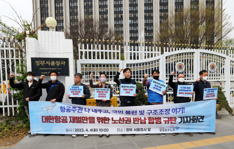 전국공공운수사회서비스노조(이하 공공운수노조)는 4일 오전 10시 정부 서울청사 앞에서 ‘대한항공 재벌만을 위한 노선권 반납 합병 규탄’ 기자회견을 열고 항공주권을 다 내주고 국민 불편 및 구조조정을 야기하고 있다며 이 같은 문제점을 제기하고 정부와 대한항공을 강력 비판했다.