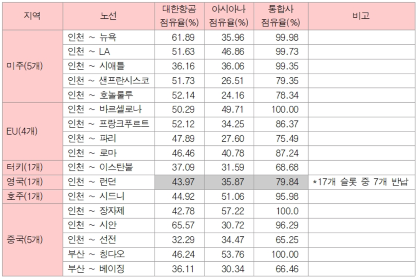 이어 “애초 공정위는 국내 LCC항공사들과 중국 국적사들의 치열한 경쟁을 이유로 이 노선들에 대해 50% 수준의 점유율로 경쟁제한성을 인정하지 않았으나 중국 당국에서는 받아들이지 않았다”며 “마찬가지로 일본의 경우도 점유율이 50% 이상인 노선들이 9개나 돼 슬롯 반납 대상 노선이 확대될 가능성이 크다”고 우려했다.