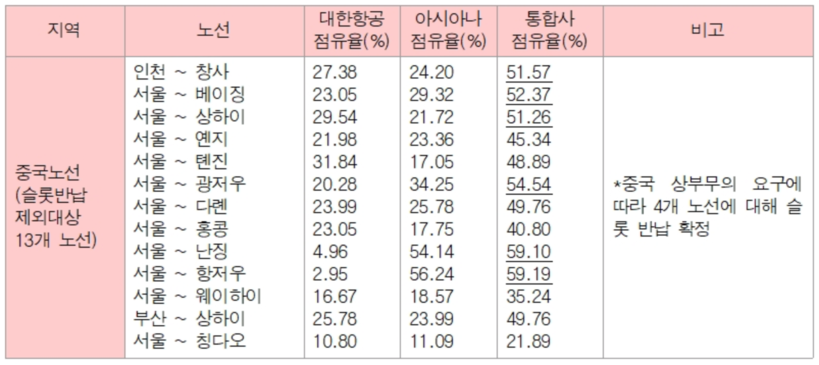 중국의 경우 공정위는 5개 노선에 대한 슬롯과 이중 3개 노선의 운수권 반납을 조건으로 제시했으나 결국 4개 노선이 추가됐다.