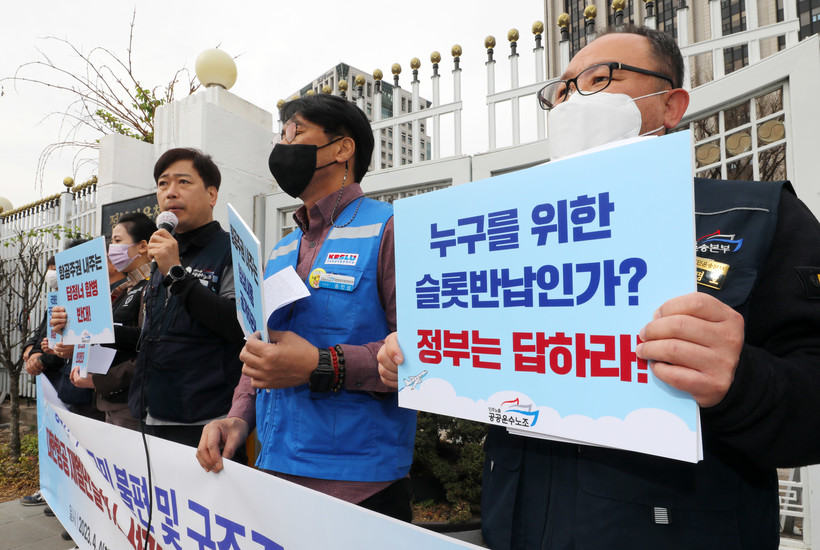 그러면서 “현재와 같은 막대한 운수권 및 슬롯 반납이 전제된 대한항공-아시아나항공의 합병 방식이 향후 구조조정으로 이어져 합병 유관 사업장 노동자들에 대한 정리해고를 강요할 것”이라며 “특히 동종업계로 흡수합병 당하는 아시아나항공 원ㆍ하청 사업장 노동자들의 고용안정은 풍전등화 처지에 놓일 수밖에 없다”고 토로했다.