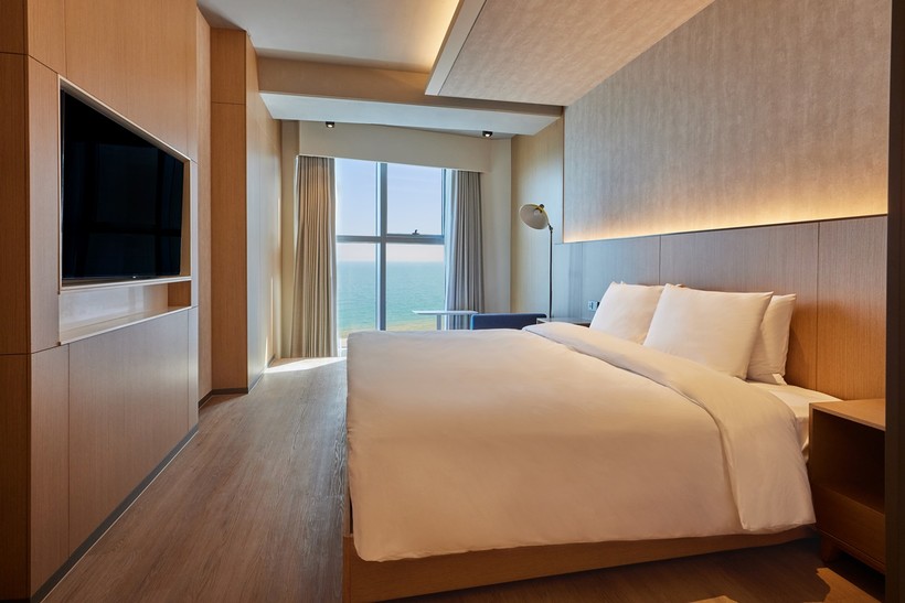 실내는 가공되지 않은 자연적인 질감과 수평선이 강조된 ‘호라이즌(Horizon)’ 콘셉트의 인테리어로 완성됐다. 특히 383실의 객실 중 최상위 객실인 오션 스위트는 해운대가 국내 대표 휴양지임을 감안해 소규모 파티나 가족 여행 용도로 이용해도 불편함이 없도록 큰 사이즈의 더블 침대 2개로 트윈룸 구성을 특화했다는 점이 눈에 뛴다.