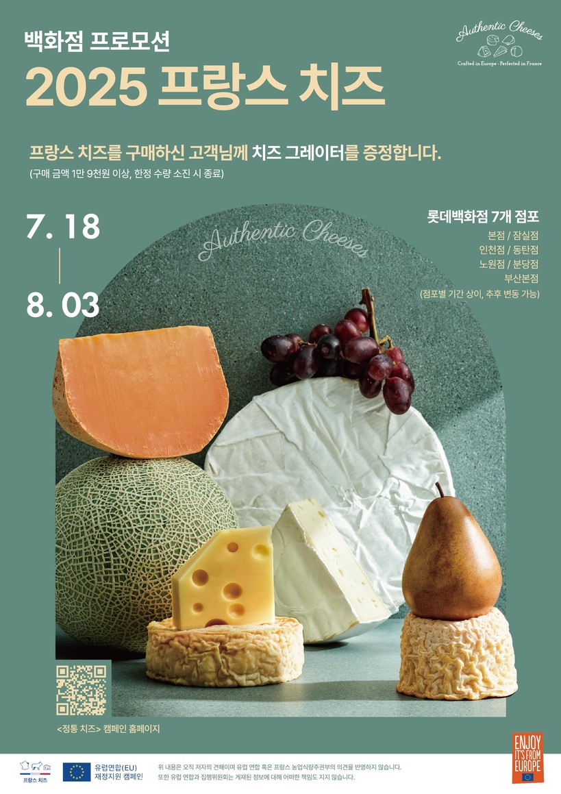 [일요주간 = 노현주 기자] 롯데백화점이 프랑스 치즈의 매력을 알리는 대규모 프로모션을 진행한다. 유럽연합(EU)과 프랑스 국립낙농협의회(CNIEL)가 주최하는 유럽·프랑스 치즈 홍보 캠페인 ‘정통 치즈(Authentic Cheeses)’의 일환으로, 오는 18일부터 롯데백화점 7개 지점에서 행사가 열린다.