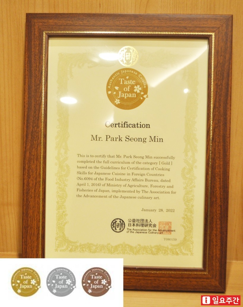 ▲지난 2월 박성민 셰프는 일본 농림수산부가 주관하는 일본 요리 기술 인정 제도에서 금메달을 수여했다. 일본 정부는 지난 2016년 4월부터 해당 제도를 운영, 일식과 관련된 지식을 비롯해 조리법, 기술 등을 평가하여 금, 은, 동메달을 발급하고 있다. 특히 금메달의 경우 최소 2년 이상 일본 현지에서 근무하며 일식을 배워야 하는 등 까다로운 조건을 충족해야 하는 것으로 알려진다. <사진=성지온 기자> |