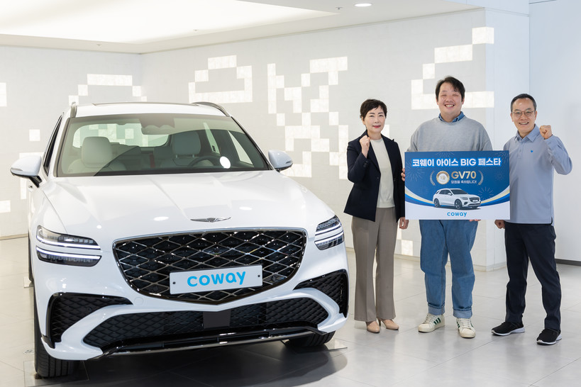 | ▲ ‘아이스 빅 페스타’ 1등 경품 제네시스 GV70 당첨자 이승현씨(중앙)가 코웨이 가산지국 권명숙 지국장(왼쪽), 문광열 코닥(오른쪽)과 기념 촬영을 하고 있다.(사진=코웨이) |