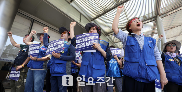 | ▲ 서울대병원 비정규직 노동자들이 지난 8월 22일 서울 종로구 서울대학교병원에서 직접고용 정규직 전환, 근로조건 개선을 통한 차별해소를 요구하며 무기한 총파업 투쟁 출정식을 하고 있는 모습. 이들은 최저임금 1만원을 도급비에 반영해 비정규직 노동자들의 근로조건을 개선, 병원 측과 도급업체는 현장 내 차별을 해소할 것을 요구했다. |