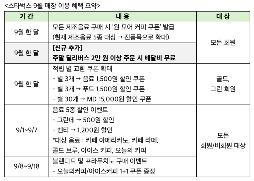 스타벅스는 원하는 장소에서 음료, 푸드 등을 편하게 즐길 수 있도록 9월 한 달 동안 주말마다 공식 앱을 통해 딜리버스를 2만 원 이상 주문한 고객에게 배달비 무료 혜택을 제공한다. 또한 딜리버스에서도 원 모어 커피 쿠폰을 사용할 수 있도록 범위를 넓혔다.