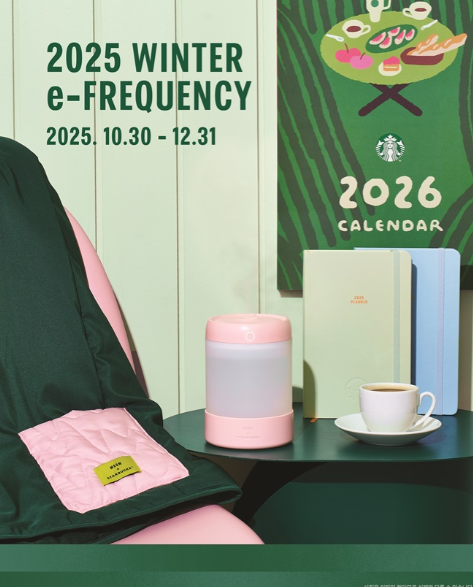 이번 겨울 e-프리퀀시 증정품은 겨울 프리퀀시의 상징인 ‘플래너(라이트 그린, 스카이 블루, 버건디)’를 비롯해 열두 달의 특별한 순간들을 담은 ‘스타벅스 2026 캘린더’, 올해 처음 선보이는 ‘MSGM+스타벅스 블랭킷(그린, 스카이 블루)’, ‘MSGM+스타벅스 가습기(그린, 핑크)’, ‘MSGM+스타벅스 양말(그린, 스카이 블루)’, ‘MSGM+스타벅스 파우치(그린, 스카이 블루)’까지 총 12종으로 다양하게 구성됐다.