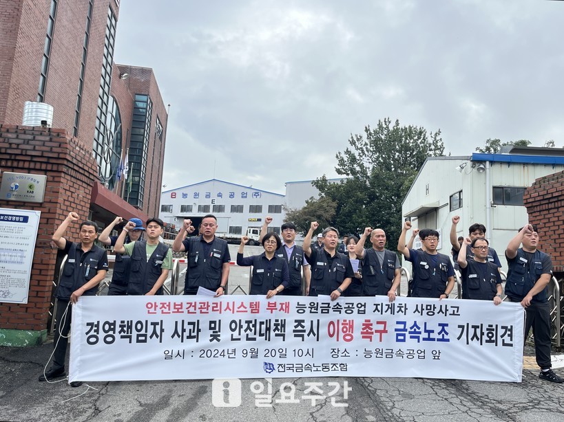 지난 20일 전국금속노동조합 서울지부 경기북부지역지회 능원금속분회(이하 금속노조)는 경기도 양주시 은현면에 위치한 능원금속공업 앞에서 기자회견을 열고 능원금속공업에 경영책임자 사과 및 안전대책 즉시 이행을 촉구했다.
