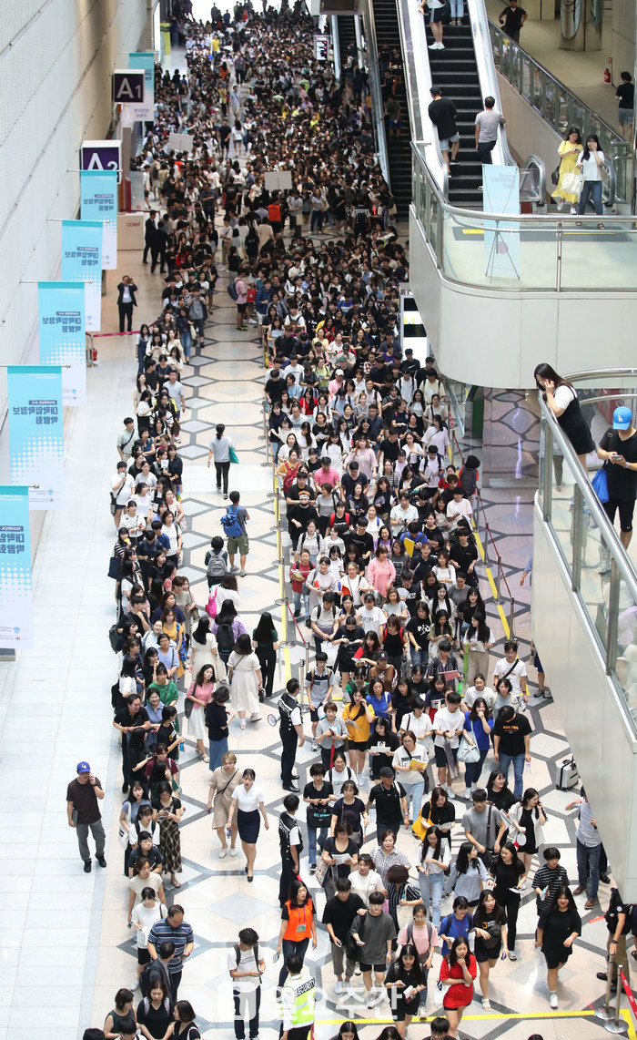 | ▲ 지난 7월 25일 서울 강남구 코엑스에서 열린 ‘2020학년도 수시 대학입학정보박람회’에서 학부모와 학생들이 입장하기 위해 줄을 서고 있는 모습. |